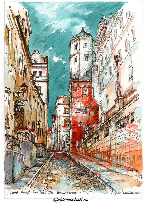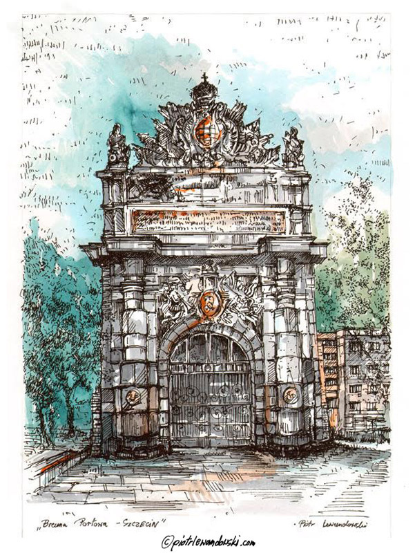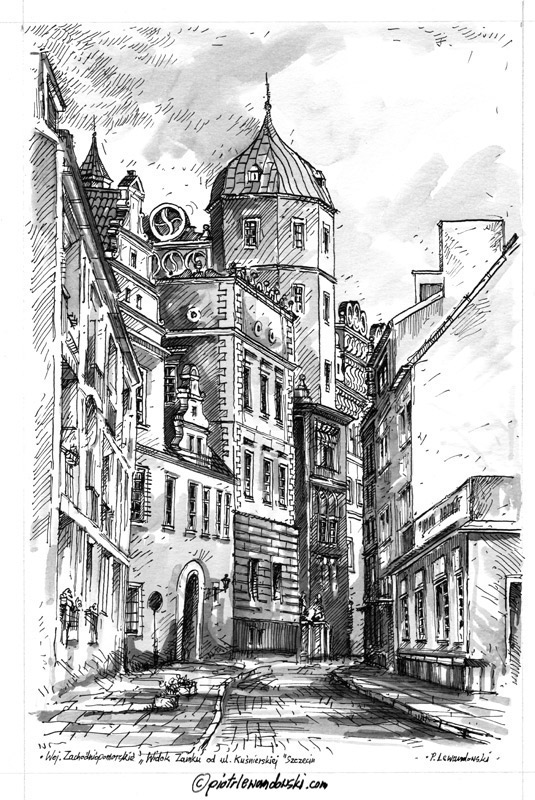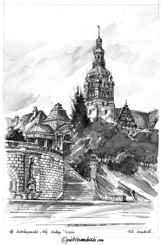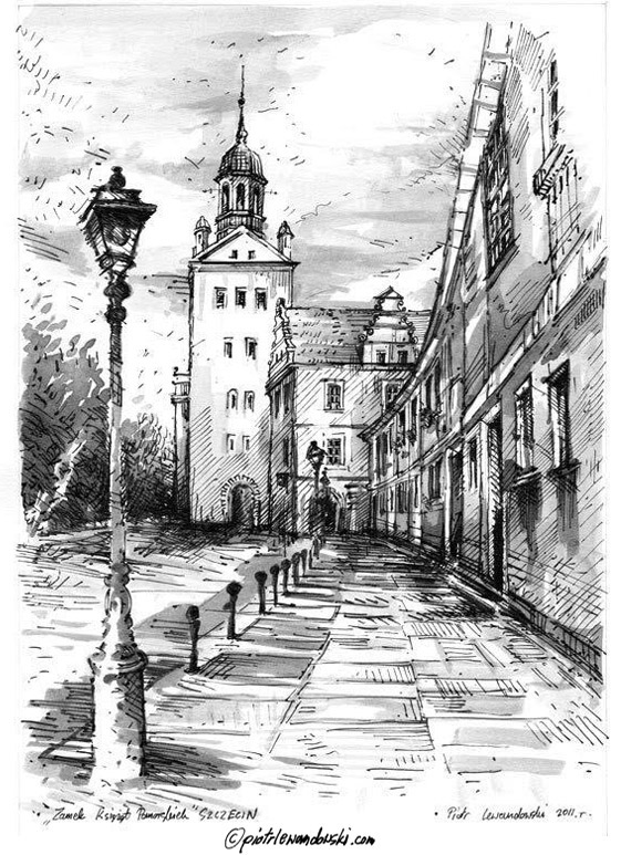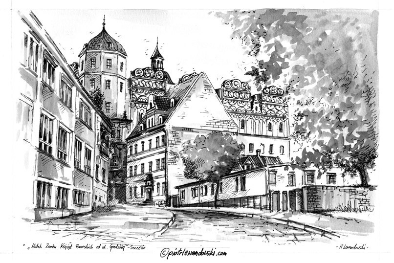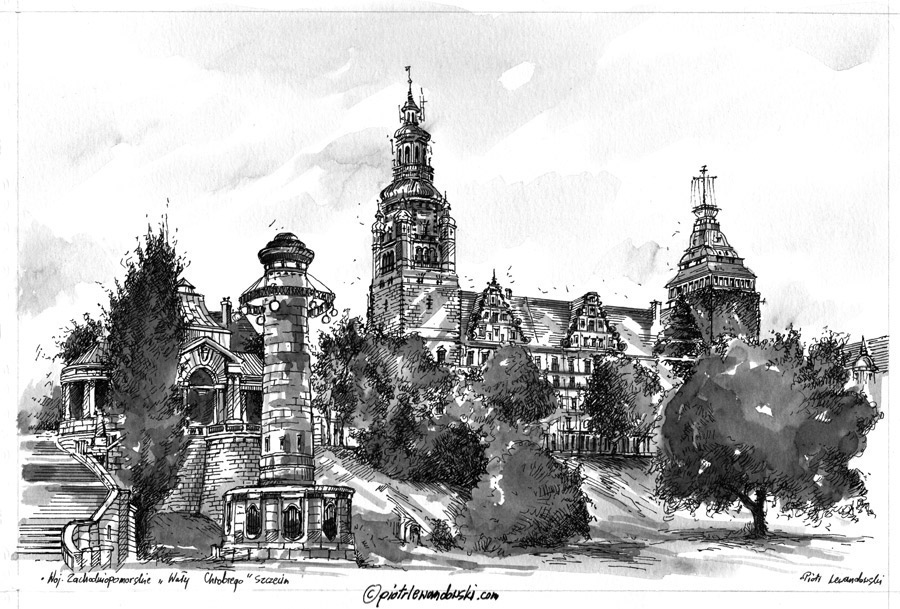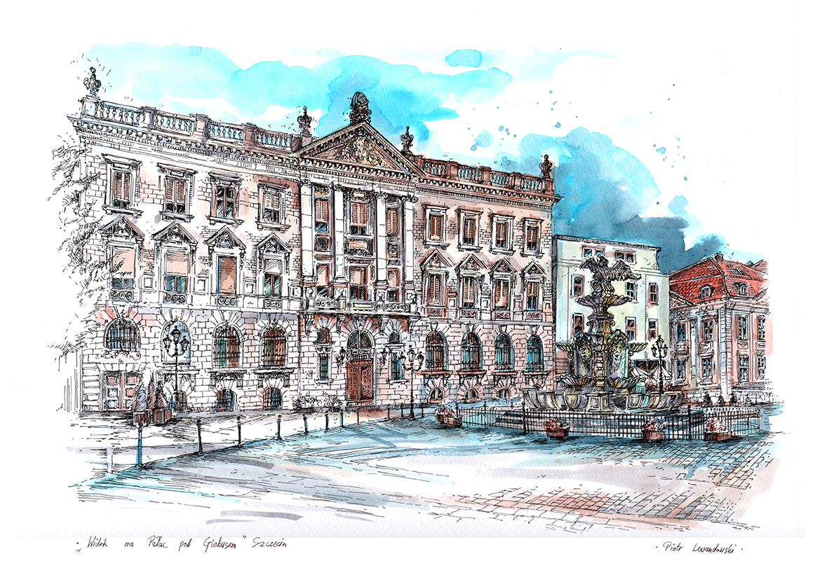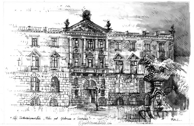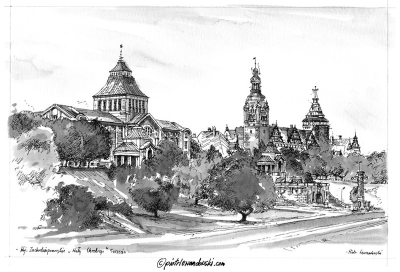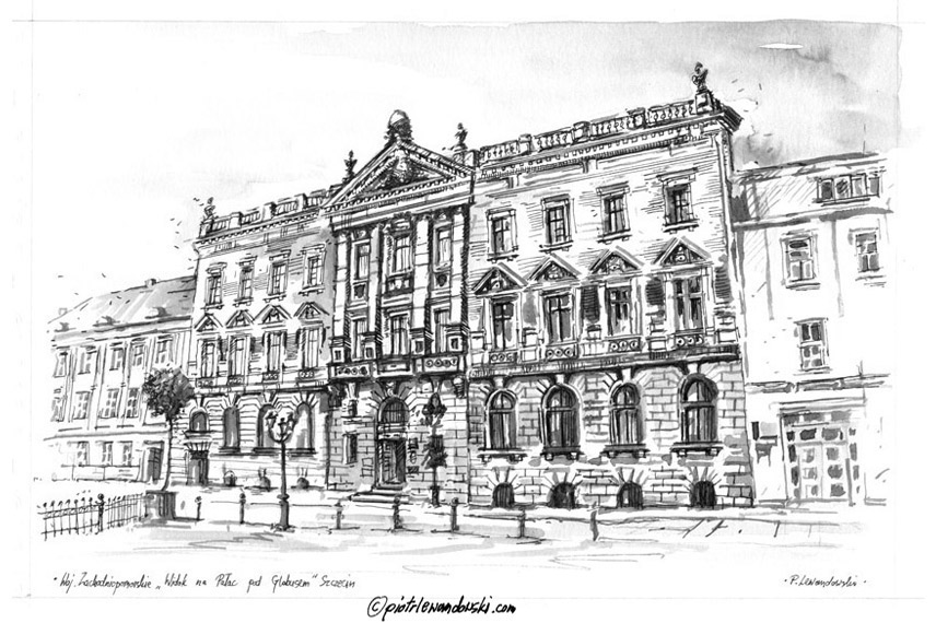 Zabytki Szczecina Wały Chrobrego - Szczecin / technika : piórko, czarny tusz / format 20 x 30 cmPałac pod Globusem - format A4 / technika : piórko , czarny tusztechnika : piórko / czarny tusz / lawowaniegrafika 21 x 29,7 cm